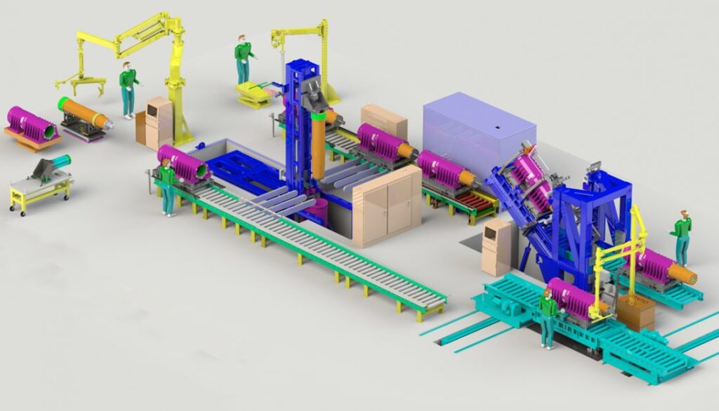Titan Mining Truck Front Strut with Conveyor Assembly/Test system for fluid power linear motion applications. Titan has built several different systems for assembling and testing hydraulic struts for heavy-duty mining trucks. Strut components are very heavy and large which make them difficult to handle safely. In addition, it is critical that the sensitive seal between the rod and the housing is not damaged during the insertion process. The front strut also serves as the pivot for the front wheel. The seal must hold pressure while the rod rotates.