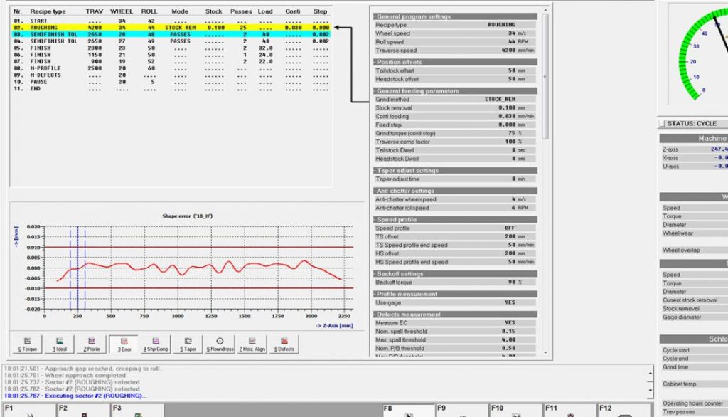Advanced automatic grinder control system supporting simple infeed to complex grinding cycles with roll inspection integration.