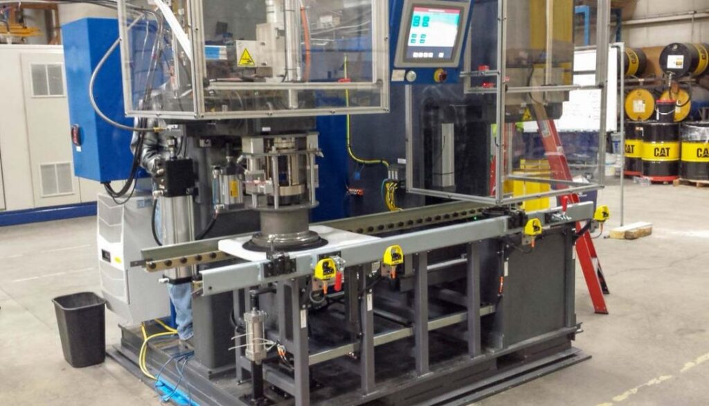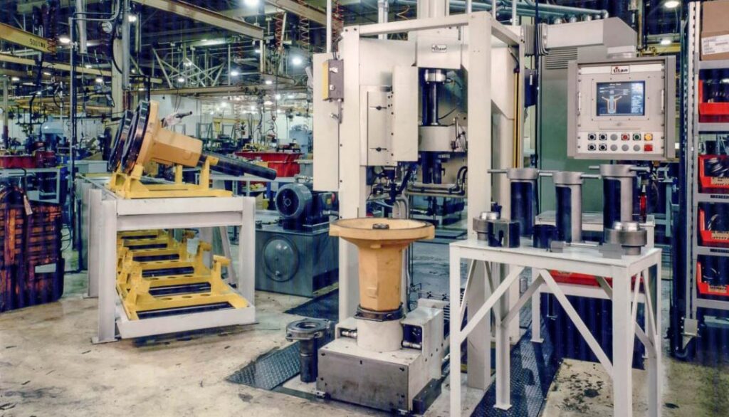 Titan Pinion Gear & Housing system for powertrain axles applications. This is a two-station assembly system for pinion shaft to the housing assembly for a line of wheel loaders for the construction industry. First station is a servo pressing station locating cups in pinion housing and bearing cones on pinion gear shaft. Second station tightens nut on pinion shaft to remove endplay and set preload on tapered roller bearings. Rolling torque is measured automatically to verify bearing preload. Manual material handling with electronically controlled assembly operations. Each step must be completed before operator moves to next stage.