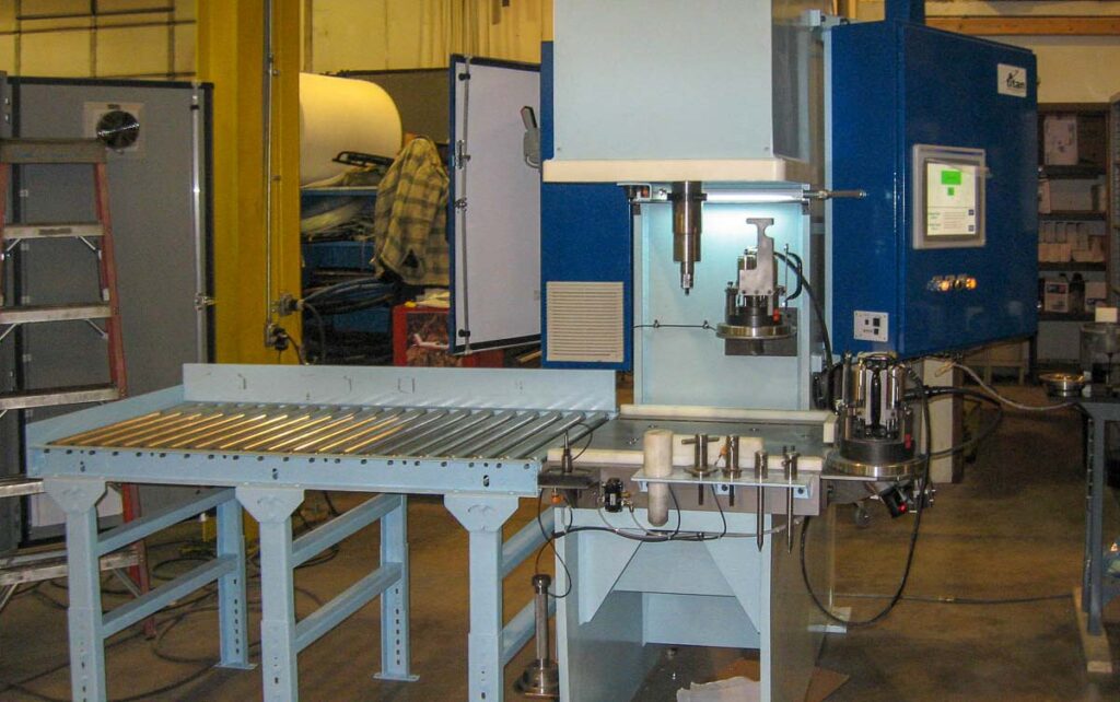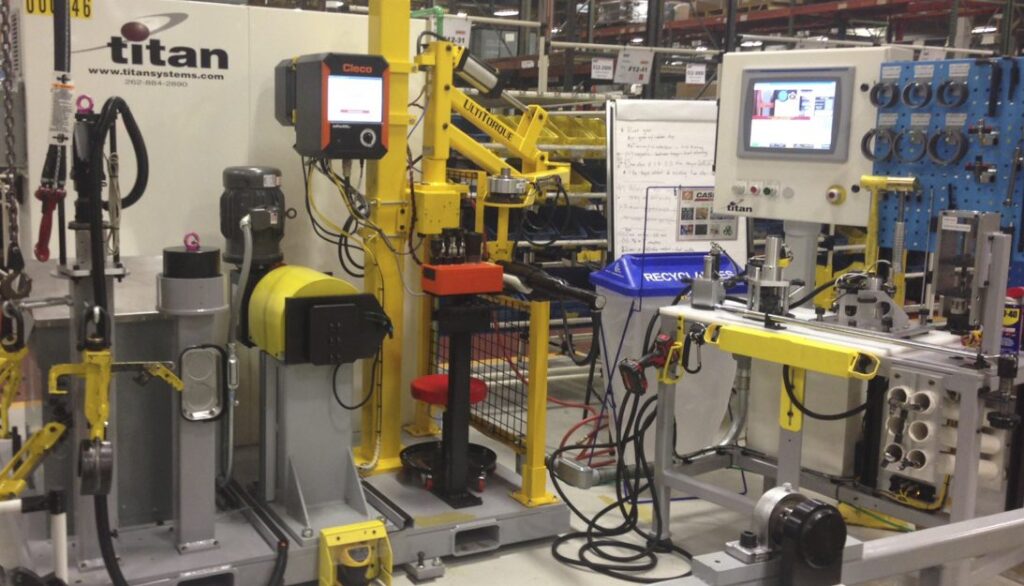Titan Combine Transmission Assembly system for powertrain transmission applications. This is a single station assembly press for the front portion of a combine transmission. The system aides manual operation for one operator.